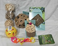 Lots of toys and treats for your bunny including Small Pet Select treats, So Natural apple slices, garden sticks, Fluffy Bun Confections, a wooden caterpillar and more.